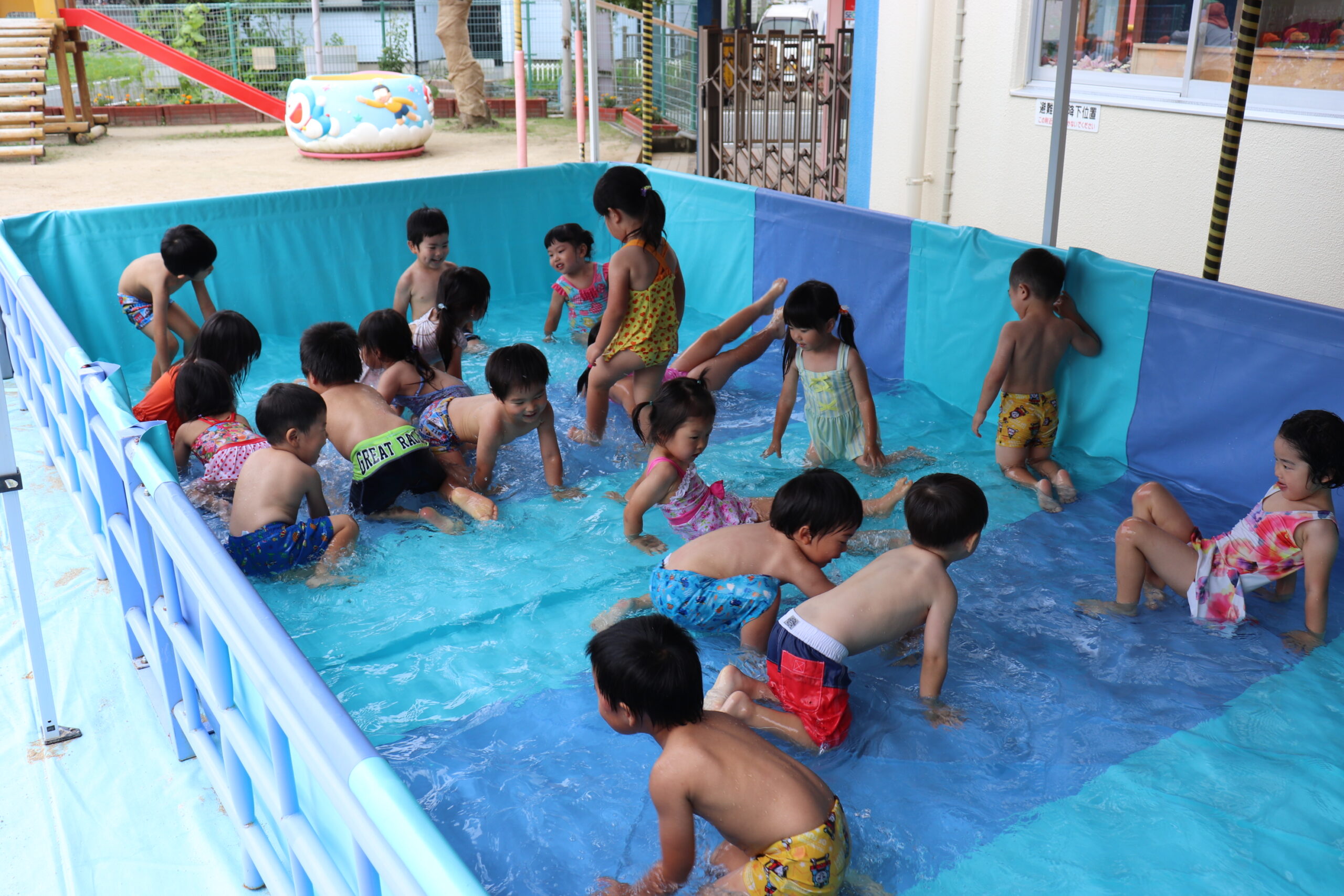 コロナウィルス感染症の予防のため、4月から中止しておりました月1回のプール指導が始まりました。3,4,5歳児が対象ですが、3歳児さんぽ組は初めてのプー...